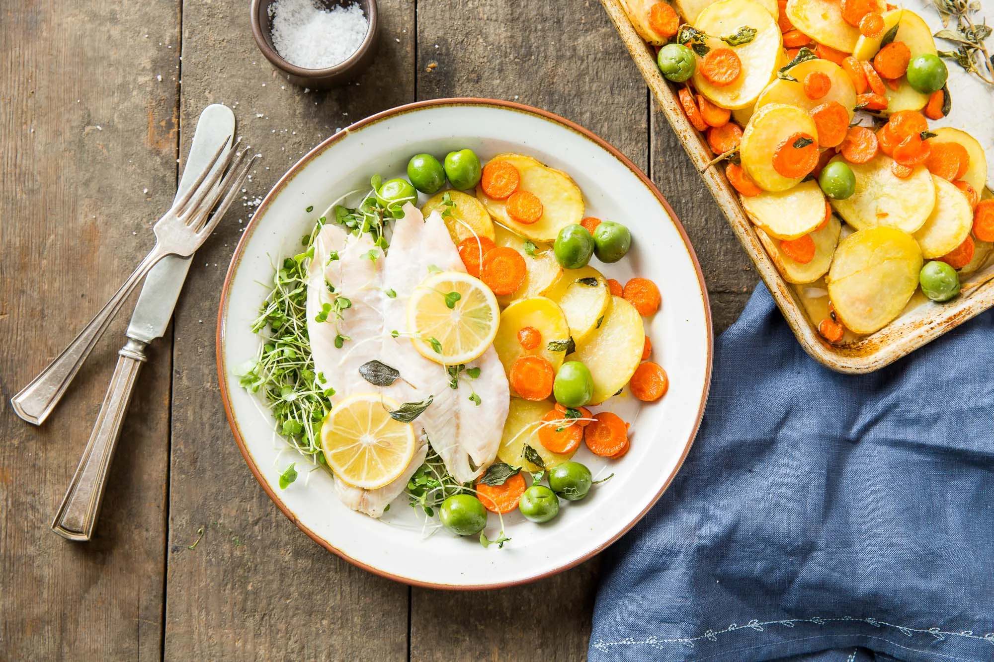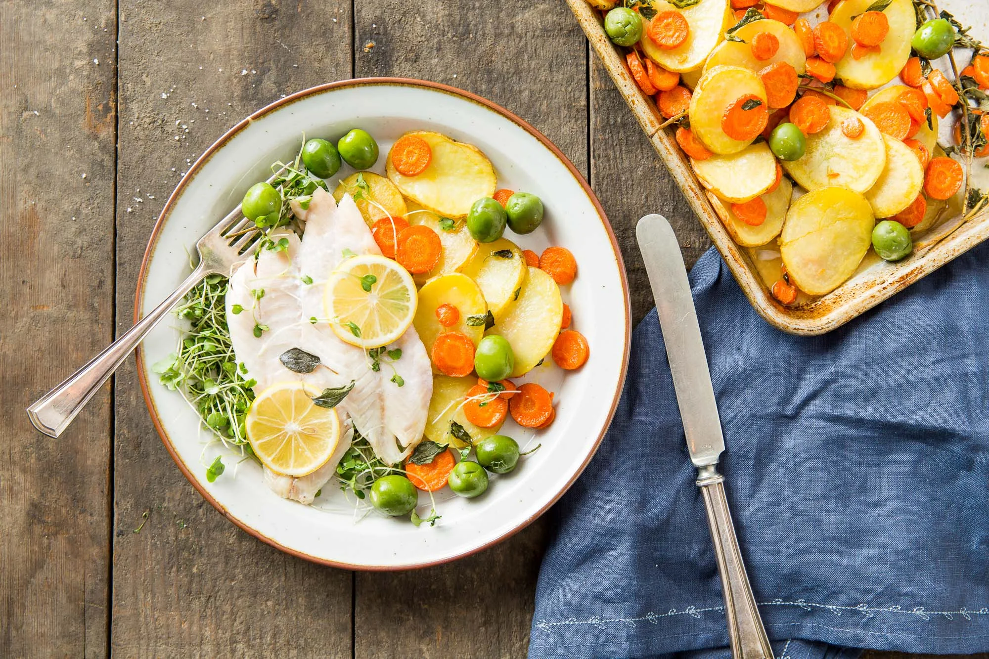- Carefully remove pan from oven, and using a spatula, push veggies to one side. Place fish on the other side, and top with remaining oregano and sliced lemon. Add olives to the baking sheet, and return to the oven. Continue roasting for about 15 minutes. Remove the tray from the oven when the fish is opaque and flakes away easily. (Check for doneness after 7 minutes or so—it may take less time, depending on the thickness of the filet.)